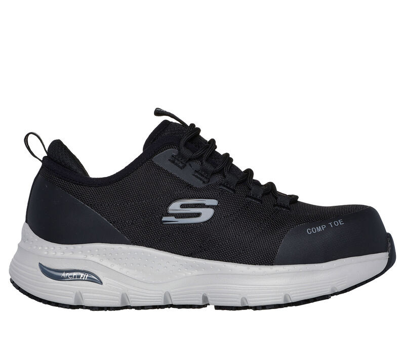 Szabadalmaztatott Skechers Arch Fit talpbetét rendszerrel (lábszakértők által tanúsított lábboltozat alátámasztással), lábszakértők által kifejlesztett formával, kivehető talpbetéttel (kényelmet biztosít a láb formájának, csökkenti a rázkódást és jobb súlyeloszlást biztosít), csúszásgátló, tapadást biztosító, olajés üzemanyagálló külső talppal, kompozit lábujjvédővel és acél talplemezzel (megfelel az EN ISO 203452011 ütésállósági és kompressziós szabványainak), hálós és szintetikus felsőrésszel és Skechers és Arch Fit embléma díszítéssel rendelkező fűzős női munkavédelmi cipő.